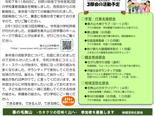 活動・できごと 更新日:2026年03月12日 学校運営協議会の活動 江府町学校運営協議会のページです。 2026年03月12日 コミュニティ・スクールだより22号 2026年02月19日 令和7年度 第3回学校運営協議会 2026年01月30日 大根パーティー<1/21> 2026年01月13日 大根の販売<12/18・19> 2026年01月13日 挨拶運動に!マスク&ティッシュ贈呈<12/16> 2025年12月04日 切り干し大根づくり<12/4> 2025年12月03日 令和7年度 第2回学校運営協議会 2025年11月26日 奥大山大根クラブ 収穫!!<11/26> 2025年12月08日 奥大山大根クラブ 間引き<10/17> 2025年09月19日 奥大山大根クラブ 始動!<9/11~9/19> 2025年09月18日 コミュニティ・スクールだより21号 2025年08月19日 十七夜花火ごみ拾い<8/18> 2025年08月15日 十七夜相撲準備<8/15> 2025年08月15日 十七夜スタンプラリー準備<8/8> 2025年07月24日 十七夜ポスター配り<7/22> 2025年07月03日 十七夜ポロシャツ デザイン 商品贈呈式が行われました 2025年05月27日 令和7年度 第1回学校運営協議会 2025年04月28日 こいのぼりボランティア<4/26> 2025年04月11日 令和6年度 第7回学校運営協議会 2025年02月27日 令和6年度 第6回学校運営協議会 2025年02月06日 コミュニティ・スクールだより20号 2025年01月08日 先生方との意見交換・令和6年度 第5回学校運営協議会 2024年12月26日 十七夜ポロシャツ デザイン募集!! 2024年12月26日 九九…81!!<12/11> 2024年12月26日 今年も作ります、切干大根<12/10> 2024年12月05日 ダイコン収穫!!<12/4> 2024年11月22日 8年生 古文暗唱聞き取り 2024年11月15日 7年生 古文暗唱聞き取り 2024年11月13日 令和6年度 第4回学校運営協議会 2024年11月07日 令和6年度 第3回学校運営協議会 2024年10月23日 大根 間引き<10/21> 2024年10月22日 丸太渡り リニューアル!!<10/19> 2024年10月17日 丸太色塗り<10/15> 2024年10月16日 丸太遊具を直します!!<10/2> 2024年09月26日 発芽しました<9/24> 2024年09月21日 奥大山大根クラブ 種まき<9/19> 2024年08月29日 コミュニティ・スクールだより19号 2024年08月21日 江尾十七夜ボランティア③<8/18> 2024年08月16日 江尾十七夜ボランティア②<8/16> 2024年08月28日 江尾十七夜ボランティア①<7/31> 2024年07月17日 鏡ヶ成 草花と昆虫 体験学習会<7/13> 2024年07月03日 令和6年度 第2回学校運営協議会 2024年06月23日 “ウラヤマ”進化!!<6/22> 2024年06月12日 裏山整備をしよう 2024年05月30日 令和6年度 第1回学校運営協議会 2024年04月27日 こいのぼりボランティア<4/27> 2024年03月25日 令和5年度 第6回学校運営協議会 2024年03月04日 令和5年度 第5回学校運営協議会 2024年01月31日 2年生 かけ算九九の聞き取り<1/15~1/18> 2024年1月15日 コミュニティ・スクールだより18号 2024年02月14日 学校運営協議会との意見交換会<12/22> 2023年12月21日 切り干し大根、完成!!<12/21> 2023年12月12日 切り干し大根づくり<12/12> 2023年11月29日 大きな大根がとれました<11/29> 2023年11月24日 【お知らせ】大根の収穫 2023年11月02日 古文暗唱ボランティア 2023年10月31日 令和5年度 第3回学校運営協議会 2023年11月10日 大根、間引き<10/16> 2023年10月15日 丸太橋リニュ~アル<10/14> 2023年10月14日 丸太橋 色塗り<10/11> 2023年10月09日 丸太橋 皮むき<10/6> 2023年10月09日 丸太橋、材料到着<10/4> 2023年10月04日 大きくなってます!<10/4> 2023年09月20日 発芽しました!!<9/19> 2023年09月14日 大根たねまき<9/14> 2022/9/30 マルチ穴開け<9/13> 2023年09月08日 今年もやります‼ 奥大山大根クラブ2023 2023年8月21日 コミュニティ・スクールだより17号 2024年04月30日 江尾十七夜ボランティア 2023年06月22日 令和5年度 第2回学校運営協議会 2023年06月17日 裏山バージョンアップ<6/17> 2023年06月05日 裏山整備2023夏 2023年05月16日 学校農園うねづくり<5/16> 2023年05月10日 令和5年度 第1回学校運営協議会 2023年04月29日 こいのぼりボランティア 2023年03月24日 第6回学校運営協議会 2023年03月08日 第5回学校運営協議会 2023年03月06日 荒田川観察会の様子を報告しました 2023年1月11日 コミュニティ・スクールだより16号 2022年12月05日 第4回学校運営協議会 2022年11月24日 かけ算九九聞き取り<2年> 2022年11月18日 古文暗唱聞き取り 2022年11月17日 ダイコン収穫!! 2022年11月14日 ブラチロル in 俣野 2022年11月15日 もうすぐ収穫(11/17実施) 2022年11月13日 アヤメの苗植えボランティア 2022年10月31日 大根、大きくなってきました 2024年12月04日 第3回学校運営協議会 2022年10月11日 間引きをしました<奥大山大根クラブ> 2022年10月09日 裏山整備2022 2022年10月11日 奥大山大根クラブ 2022年10月04日 ペンキ塗り 2025年02月06日 コミュニティ・スクールだより15号 2022年09月29日 今年もやります「裏山整備」 2022年09月14日 第2回学校運営協議会 2022年05月08日 こいのぼりボランティア 2022年05月02日 第1回学校運営協議会 2022年05月02日 CSだよりバックナンバー 2022年05月02日 R2年~R3年の学校運営協議会 議事録