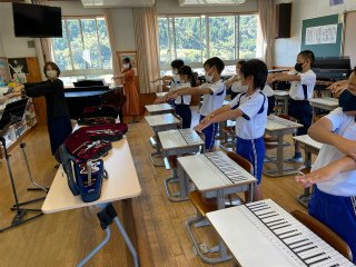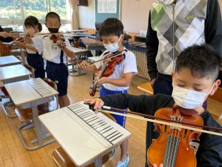 先日 、美しい音色を聞かせていただいた「バイオリン」。9月30日(金)は、楽しみに待っていた3年生の「体験」の日です。前回同様、三朝バイオリン美術館の館長さん、そして地元のピアノの先生においでいただき、バイオリンを体験させていただきました。