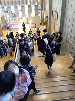 会場のキャパシティの関係で在校生の参列は6~8年生でしたが、卒業生が巣立つ頃には1~5年生もブナの森校舎から駆けつけ盛大に見送りをしました。