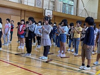 まず初めに、9月の歌「とどけよう このゆめを」を全員で歌いました。今月は、3年生のリコーダー演奏付き。きれいな歌声とリコーダーの音色が響きわたりました。先日、バイオリンともコラボした、得意のリコーダーです。