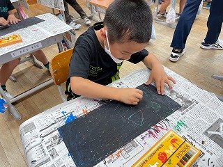 ゲストティーチャーと一緒に「Color」と「Shape」の復習をした後、「Pick up 〇〇」のかけ声で指定された色のクレヨンを取り、画用紙の決められた場所を塗りつぶし、最後に「Black」で全体をダイナミックに塗りつぶします。その上から「Nail」で指定された形を描くと、あ~ら不思議。きれいな模様が現れました。