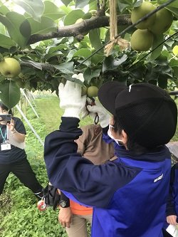 摘果作業は、複数個ついている幼果から大きくて形の良いものを1果残します。どの幼果を残すかが難しく、生徒は梨園の管理者の方に聞きながら慎重に摘果。摘果が終わるとホッとした表情を見せていました。