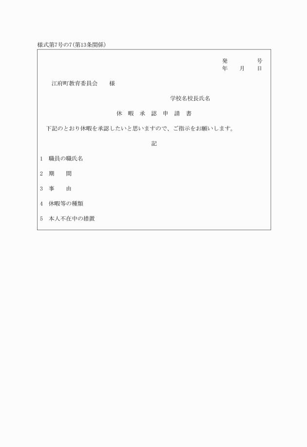 5 職員は、子育て部分休暇を受けようとするときは、あらかじめ、給与・勤怠管理システム(給与・勤怠管理システムによることができない職員にあっては、子育て部分休暇承認申請書(様式7号の5))により、校長の承認を受けなければならない。