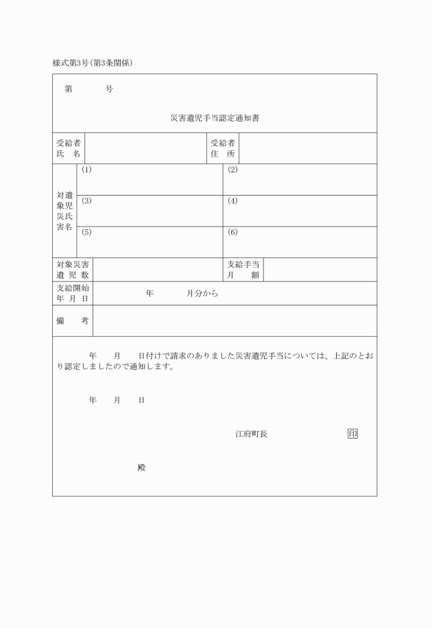 第3条 町長は、認定の請求があった場合において、災害遺児手当(以下「手当」という。)の受給資格及びその額について認定をしたときは、災害遺児手当認定通知書(様式第3号)を当該請求者に交付しなければならない。