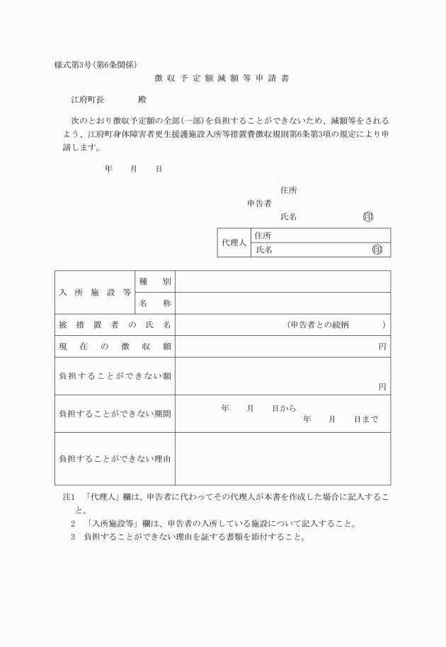 2 町長は、徴収予定額がその被徴収者の負担能力に対し過重であると認めるときは、当該被徴収者の申請又は職権により、徴収予定額を減額し、又は施設入所等の措置に要する費用の全部を徴収しないこととすること(以下「減額等」という。)ができる。