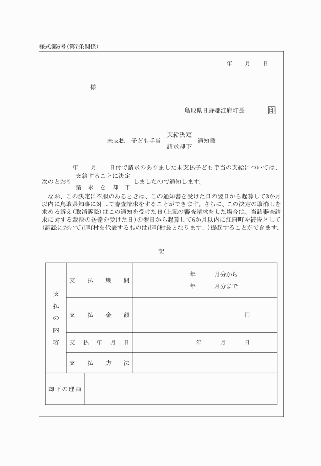 2 子ども手当の支払いを行う場合には、子ども手当支払通知書(様式第8号)により受給者に送付するものとする。